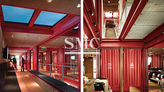 The Puma City, created by the New York construction team LOT-EK and Puma, is a massive space plan. It is a mobile concept store that is freely assembled from 24 70-foot containers. The staggered stacks show a virtual change and a translucent and opaque aesthetic. This "moving castle" with red and giant Puma logo not only maintains Puma's brand image, but also attracts a lot of eyeballs; the interior design of the container is simple and clear, the space is evenly distributed, and it is a whole when gathered together. The Puma container, when separated, became a modern Puma City.