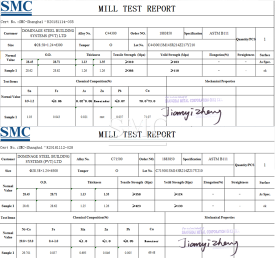 Condenser Tube, C7150T-O, OD: 28.58mm, Wall Thickness: